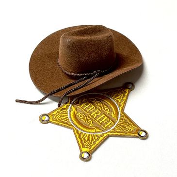 Featuring a brown cowboy hat, a gold sheriff’s badge, and a plaid bow tie. The sheriff accessories are so darn cute, they should be illegal… The cowboy hat is made of molded felt, and the gold sheriff’s badge is an intricately embroidered, permanent patch.
